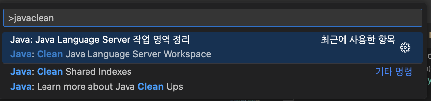먼저, 명령어 팔레트(cmd + shift + p)를 열고, java clean을 쳐서 작업 영역 정리를 해주자.