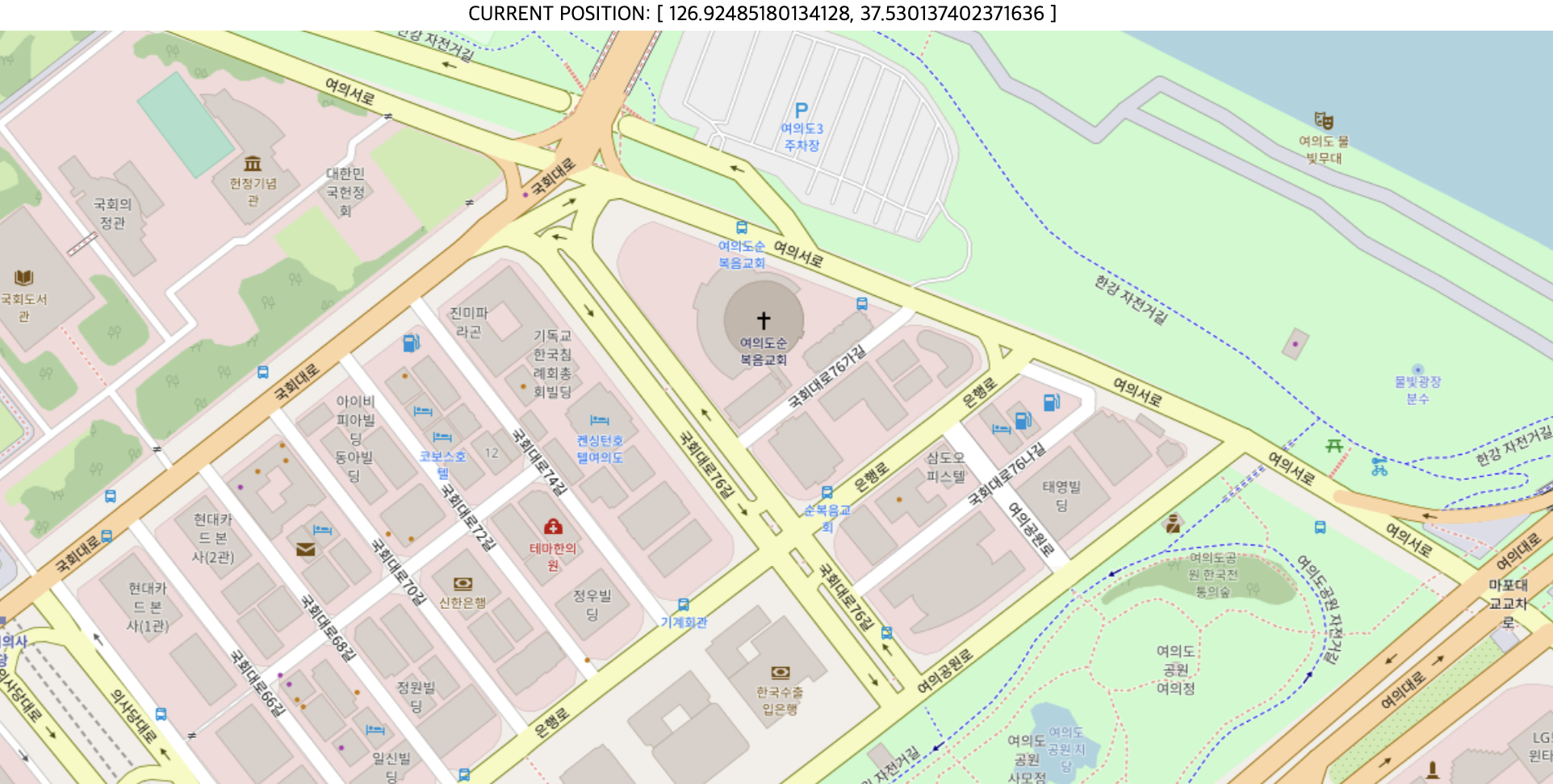 자, 이제 지도에서 클릭을 해보면 상단의 CURRENT POSITION에 우리가 원하는 위도 경도 값이 출력되는 것을 볼 수 있다!