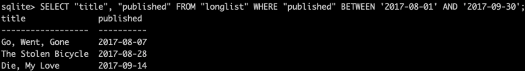 WHERE "published" BETWEEN '2017-08' AND '2017-09';