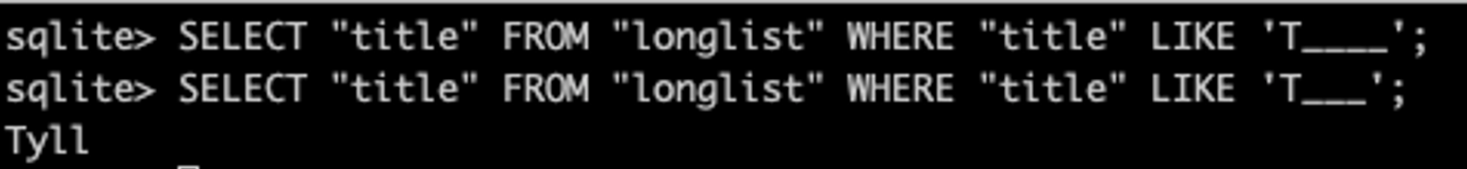 예를 들어, T로 시작하는 4글자의 책 제목을 조회하고 싶다면 아래와 같이 조회 할 수 있다.