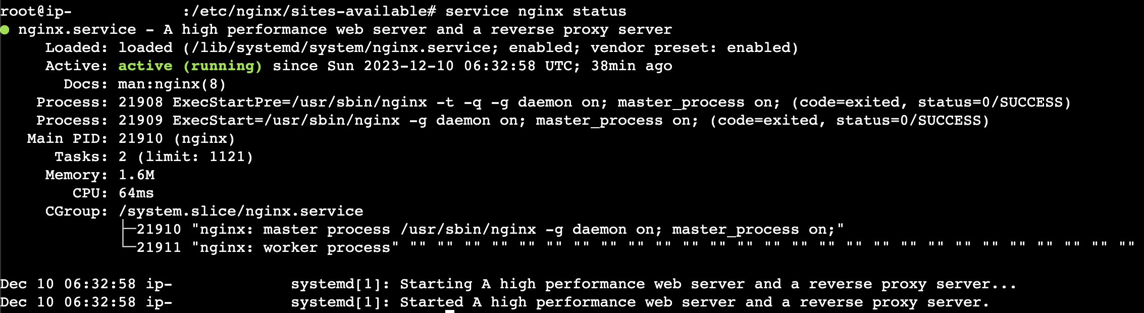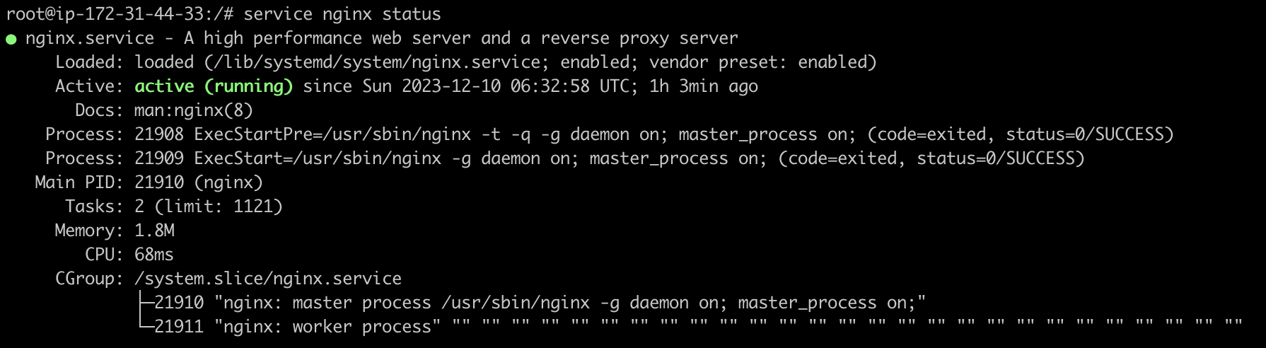 다시 한번 service nginx status를 이용해 상태 체크를 해보면 정상적으로 작동하고 있는 것을 볼 수 있다.