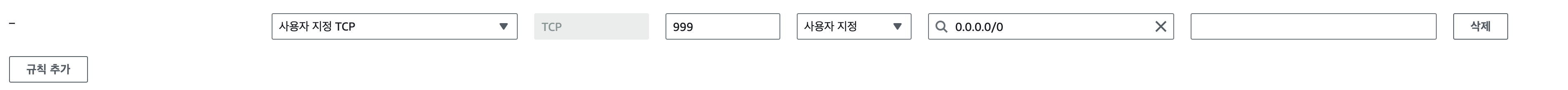 여기에서 규칙 추가 버튼 부분을 클릭하여, 추가로 포트를 열어준다. 설정 값을 아래처럼 선택해 주면 된다.