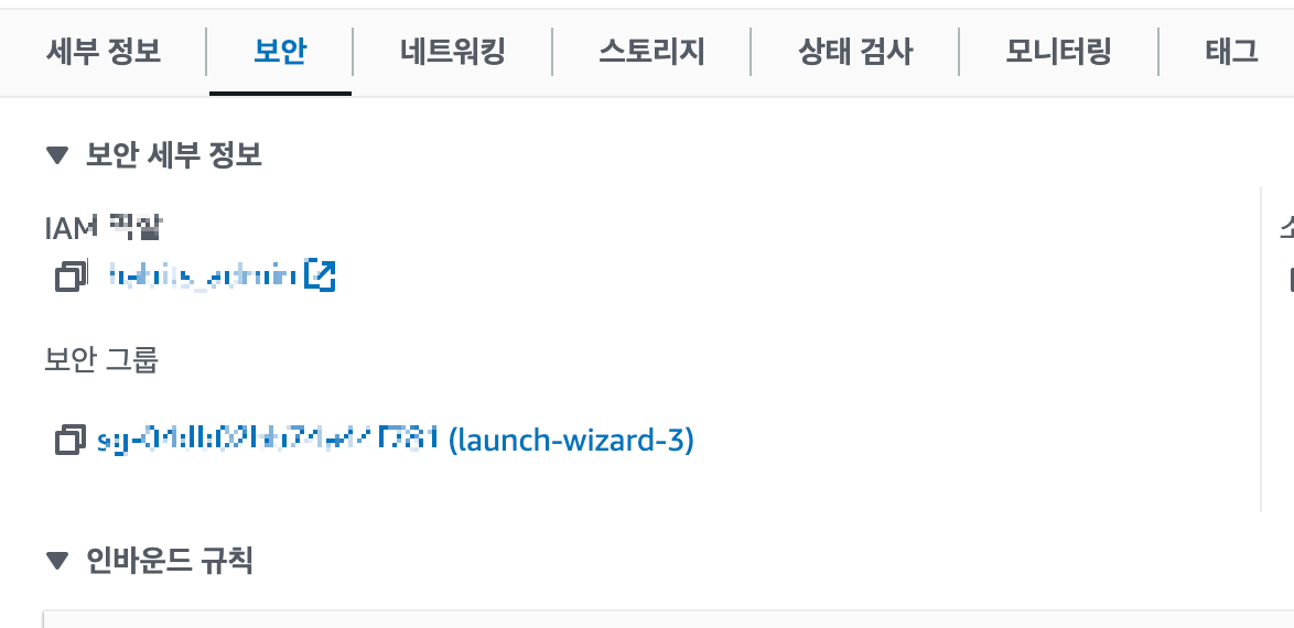 AWS에서 EC2 -> 인스턴스 선택 -> 하단 보안 탭 클릭 -> 보안 그룹 명을 클릭 한다.