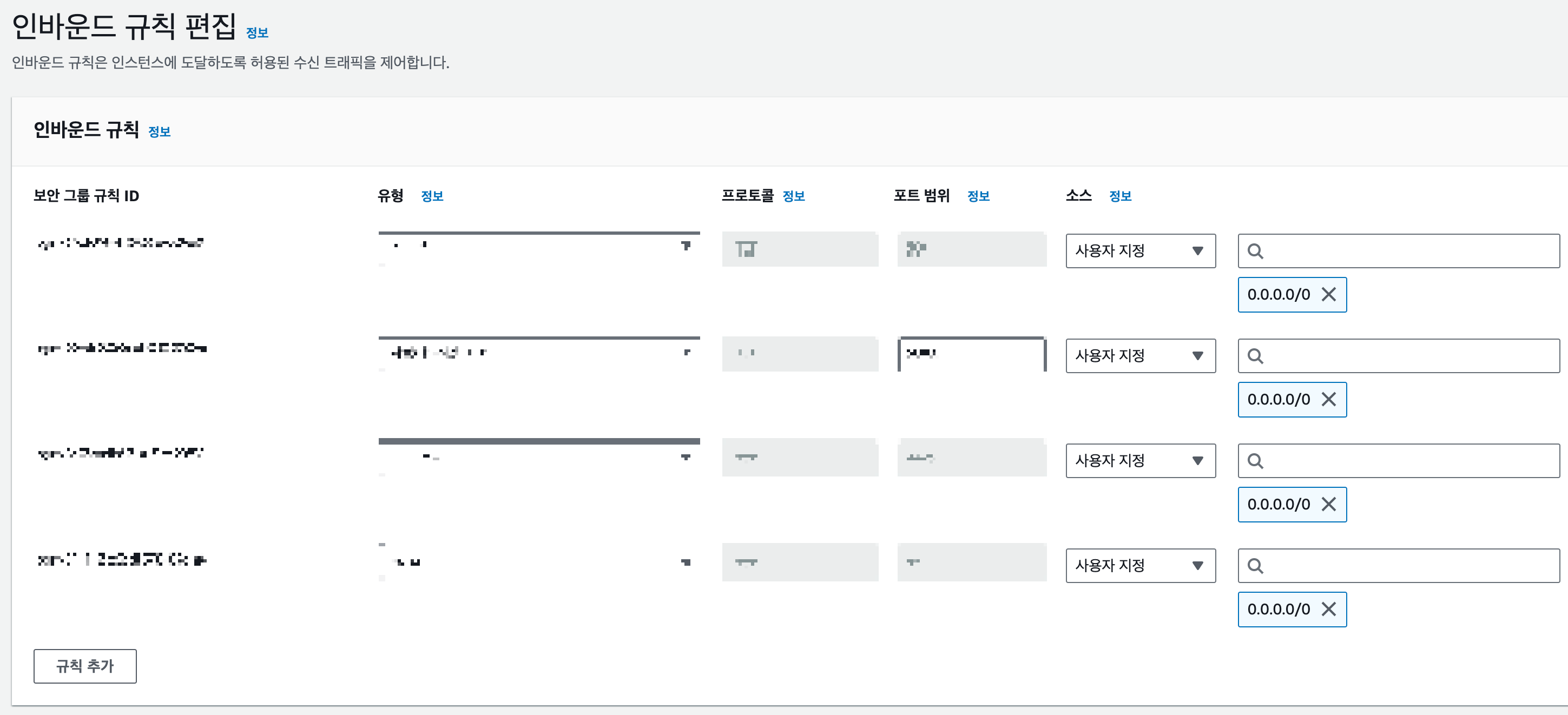 그런 다음 하단의 인바운드 규칙 탭 선택 -> 인바운드 큐칙 편집 버튼을 클릭하면 아래와 같은 화면으로 접근이 된다.