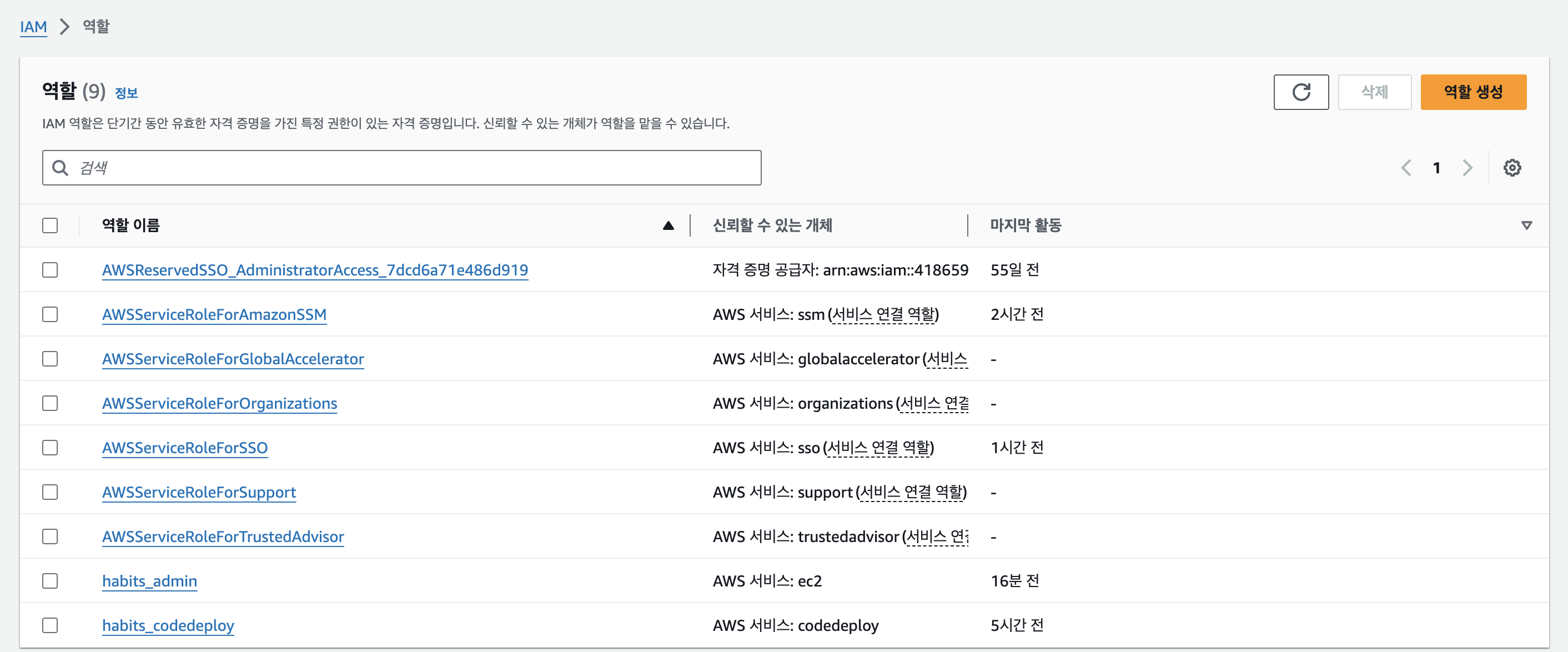 위처럼 설정을 해주고 나면, 해당 역할의 이름과 설명을 작성하고 생성 버튼을 누르면 역할이 정상적으로 생성된 것을 볼 수 있다.