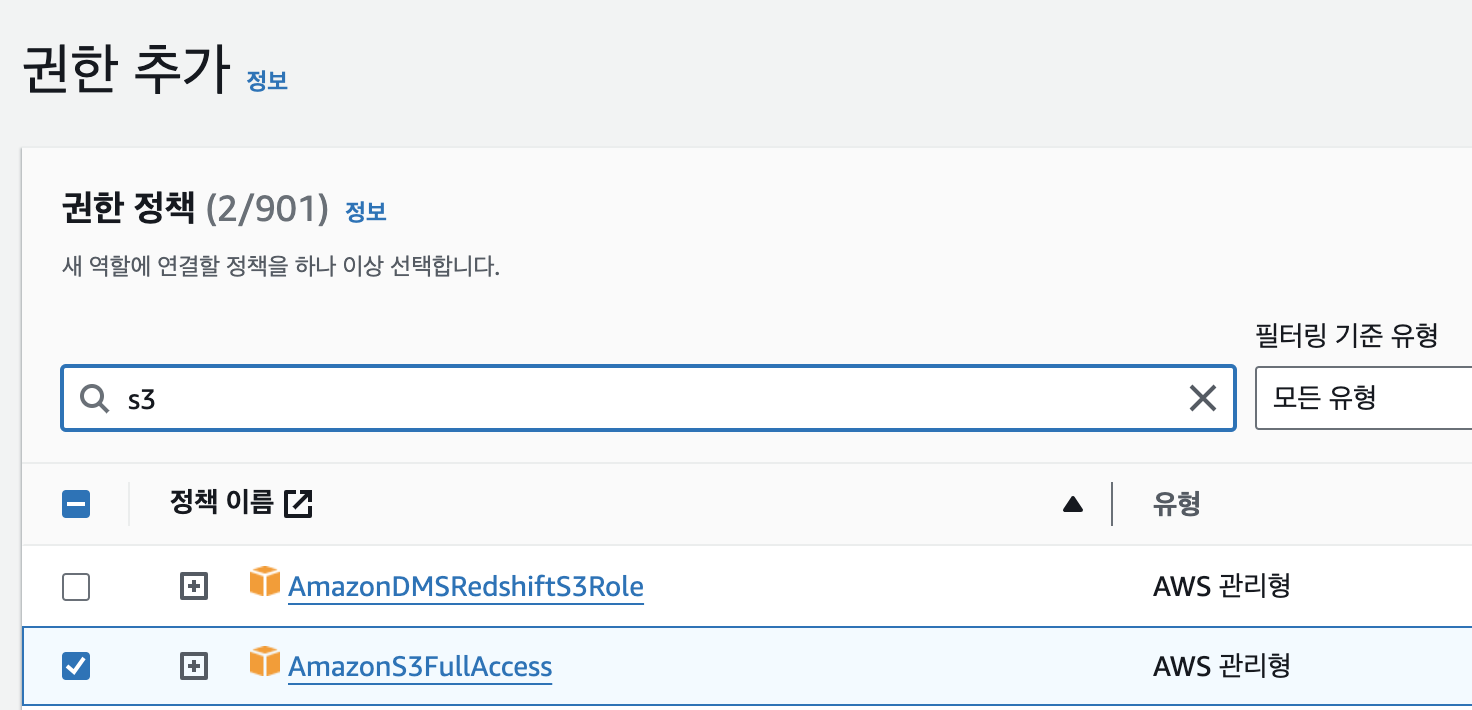 원래대로라면 AmazonEC2FullAccess, AmazonS3FullAccess 등을 설정해주어야 하지만,