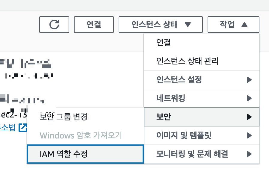 EC2 페이지에서 -> EC2 인스턴스 선택 -> 우측상단 작업 탭 -> 보안 -> IAM 역할 수정 버튼 클릭 해준다.