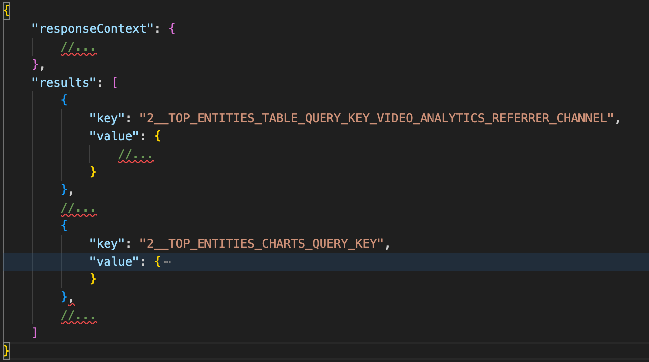 예를 들어, extractorParams의 2__TOP_ENTITIES_TABLE_QUERY_KEY 라는 쿼리 노드는 영상의 조회수, 조회 시간 등 각종 데이터를 테이블 형태로 나오는 쿼리이다. 그래서 이 테이블 결과에서 VIDEO 디멘션 값들(VIDEO ID) 추출해라. 라는 뜻이고,