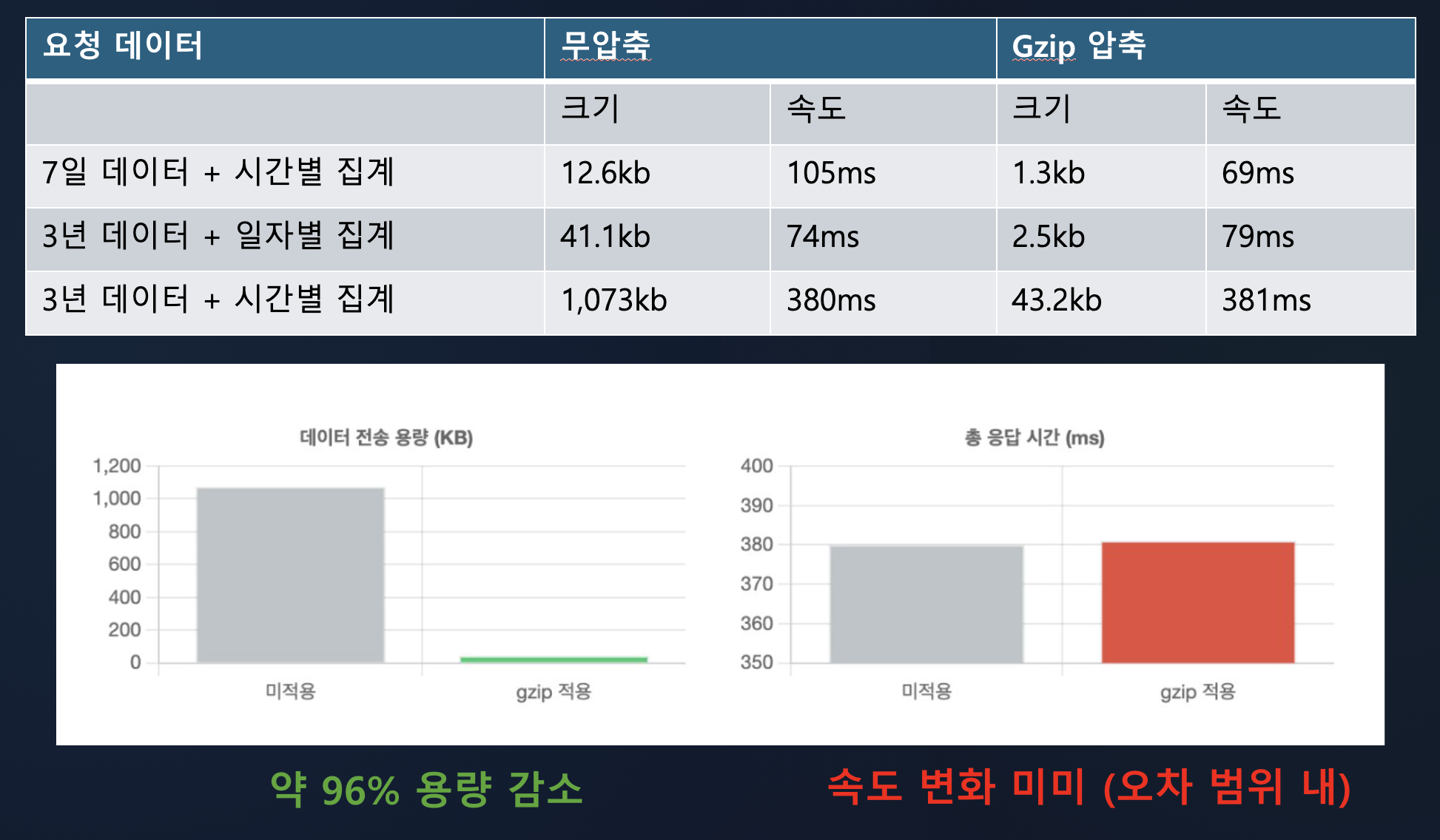 KeyLink에서 2~3년간의 일자별 데이터를 조회 했을 때, 데이터의 크기가 일반적으로 gzip의 윈도우 사이즈(32kb)보다 작은 것을 확인했고, 크게 문제되지 않을 것이라 판단했다.
