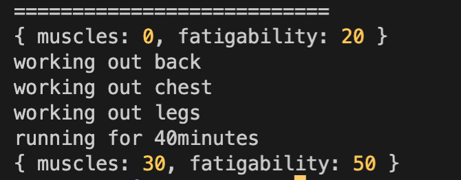 console.log(mark.currentState); //{ muscles: 40, fatigability: 70 }