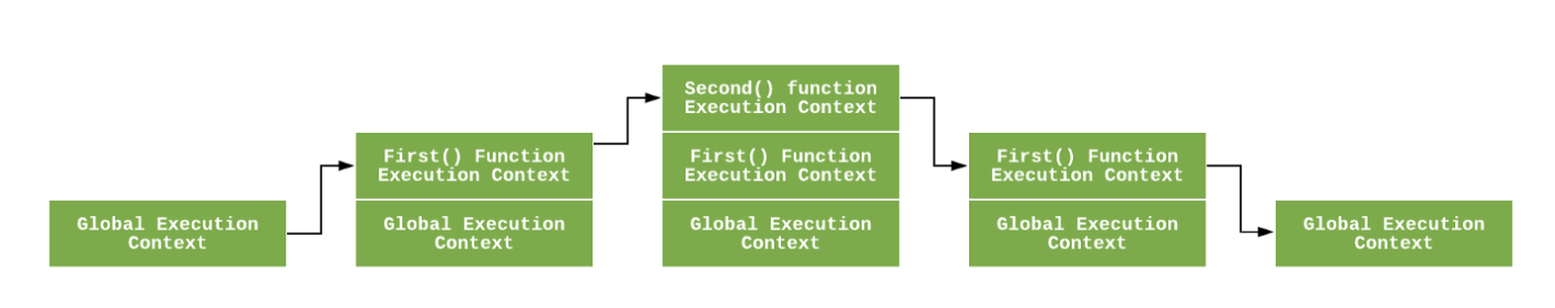 JS엔진이 처음 스크립트 코드를 만나게 되면, 가장 먼저 global excution context를 생성하고, 해당 context를 current execution stack에 집어 넣는다(push). JS엔진이 스크립트를 읽다가 함수가 호출된 부분을 만나게 되면, 엔진은 매번 새로운 function execution context을 생성하고, Execution stack의 가장 위에 집어 넣고(push), 그 아래에 있던 함수가 실행되게 된다.