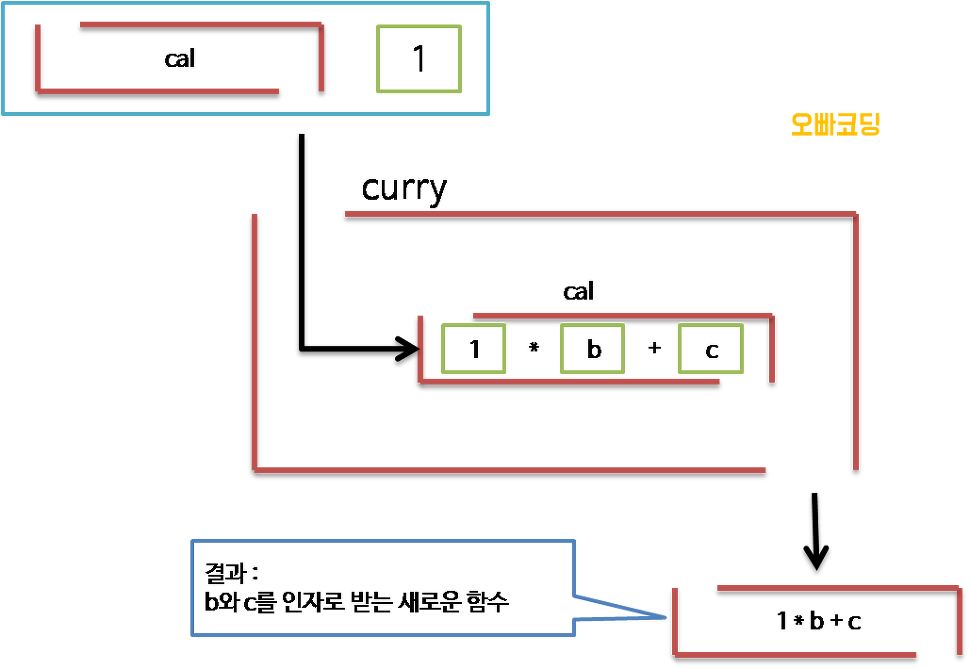 sum(a, b) 라는 기존의 방식에서 curriedSum(a)(b) 와 같은 방식으로 바뀌게 되는 것이다.