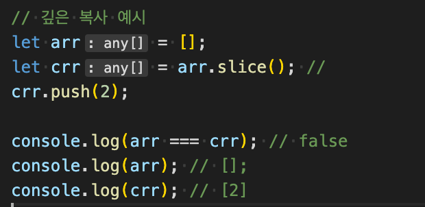 얕은 복사와는 다르게, crr에 2라는 값을 push 했음에도, arr에는 어떠한 값도 들어있지 않았음을 알 수 있다.