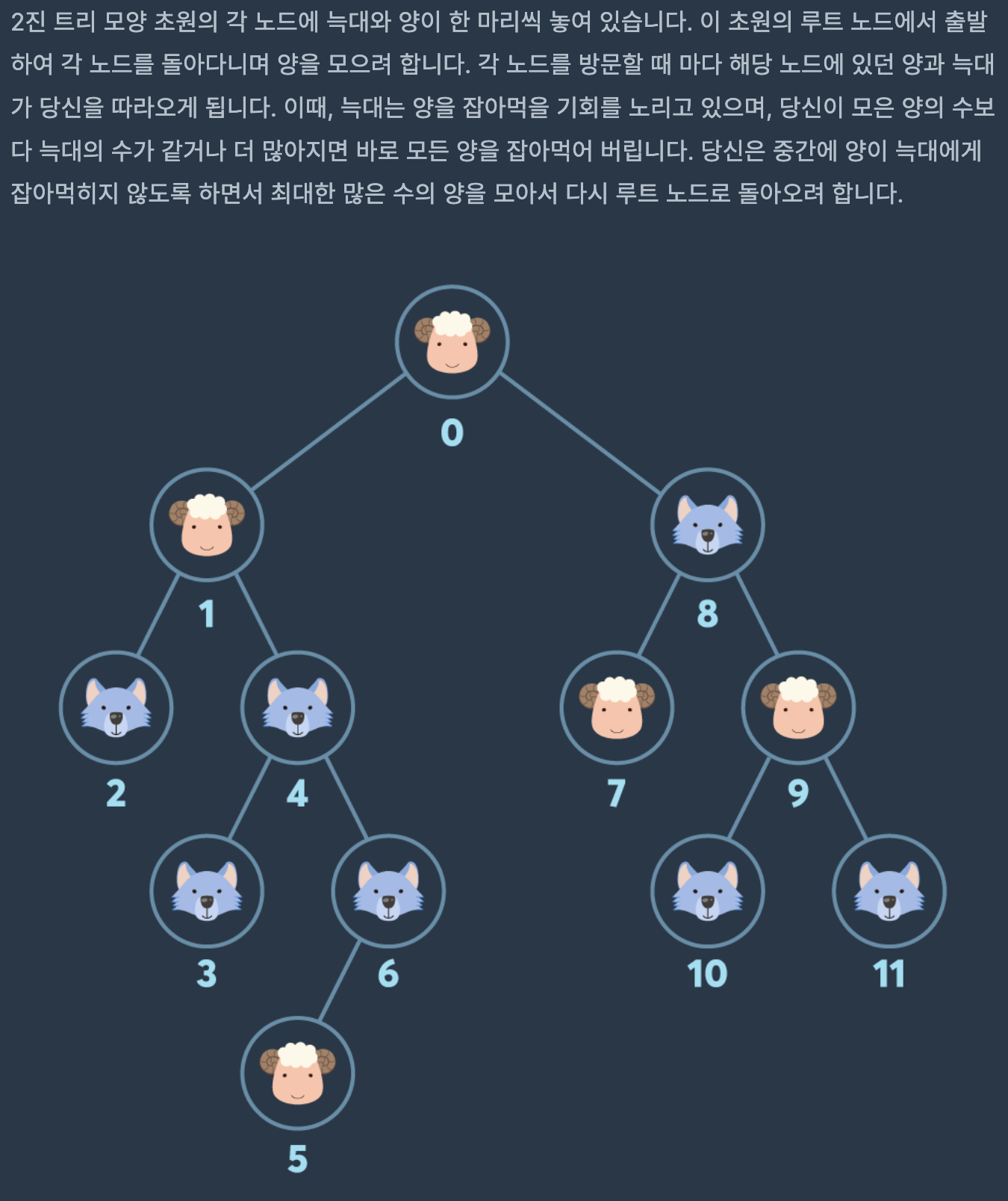 위와 같은 방식으로 탐색을 하되, 만약 해당 노드를 방문시 sheep <= wolf가 되게 되면 return 하여 재귀를 종료한다.