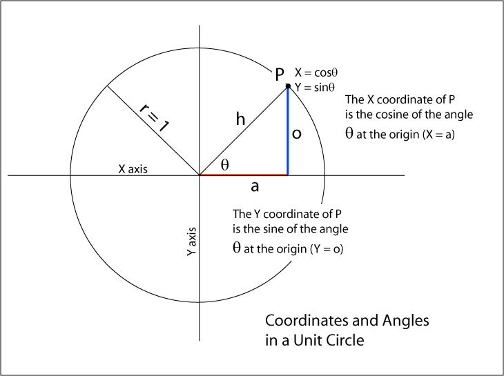 그러면, 위 그림에서 볼 수 있듯이 내각(θ)를 가지는 x, y의 좌표는 (cosθ, sinθ)가 되게 됩니다.