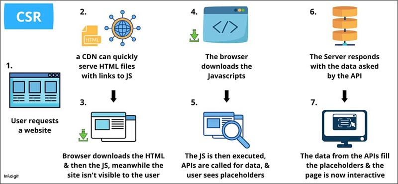 CSR 방식은 브라우저(Client Side)에서 JS파일을 실행시켜 이 뼈대만 있는 HTML 파일에 유저들에게 보여주고 싶은 컨텐트들을 넣어주는 방식으로 동작합니다.