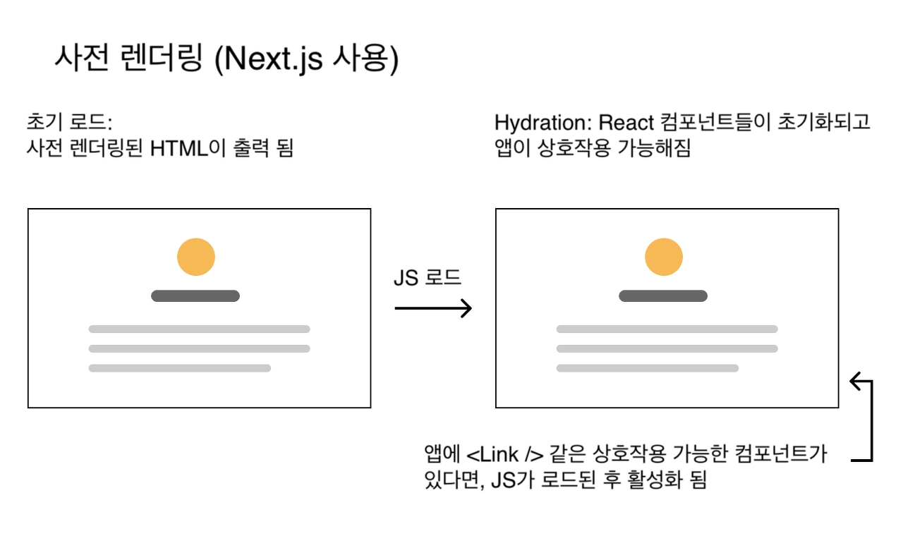 일단, 렌더링된 화면을 유저에게 보내 준 후, Next.js는 JS파일을 받아오고 실행시켜 유저와 상호작용이 가능한 상태가 됩니다.