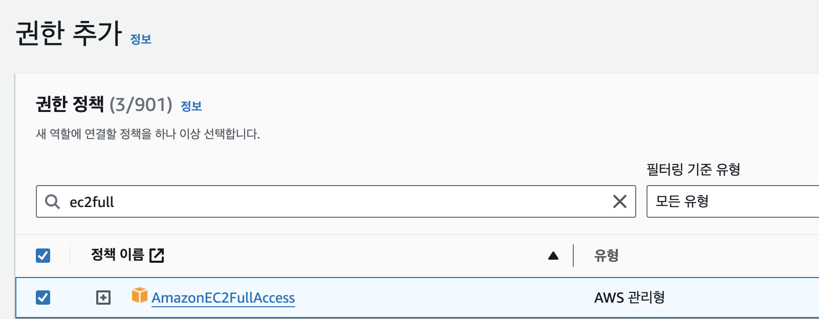 원래대로라면 AmazonEC2FullAccess, AmazonS3FullAccess 등을 설정해주어야 하지만,