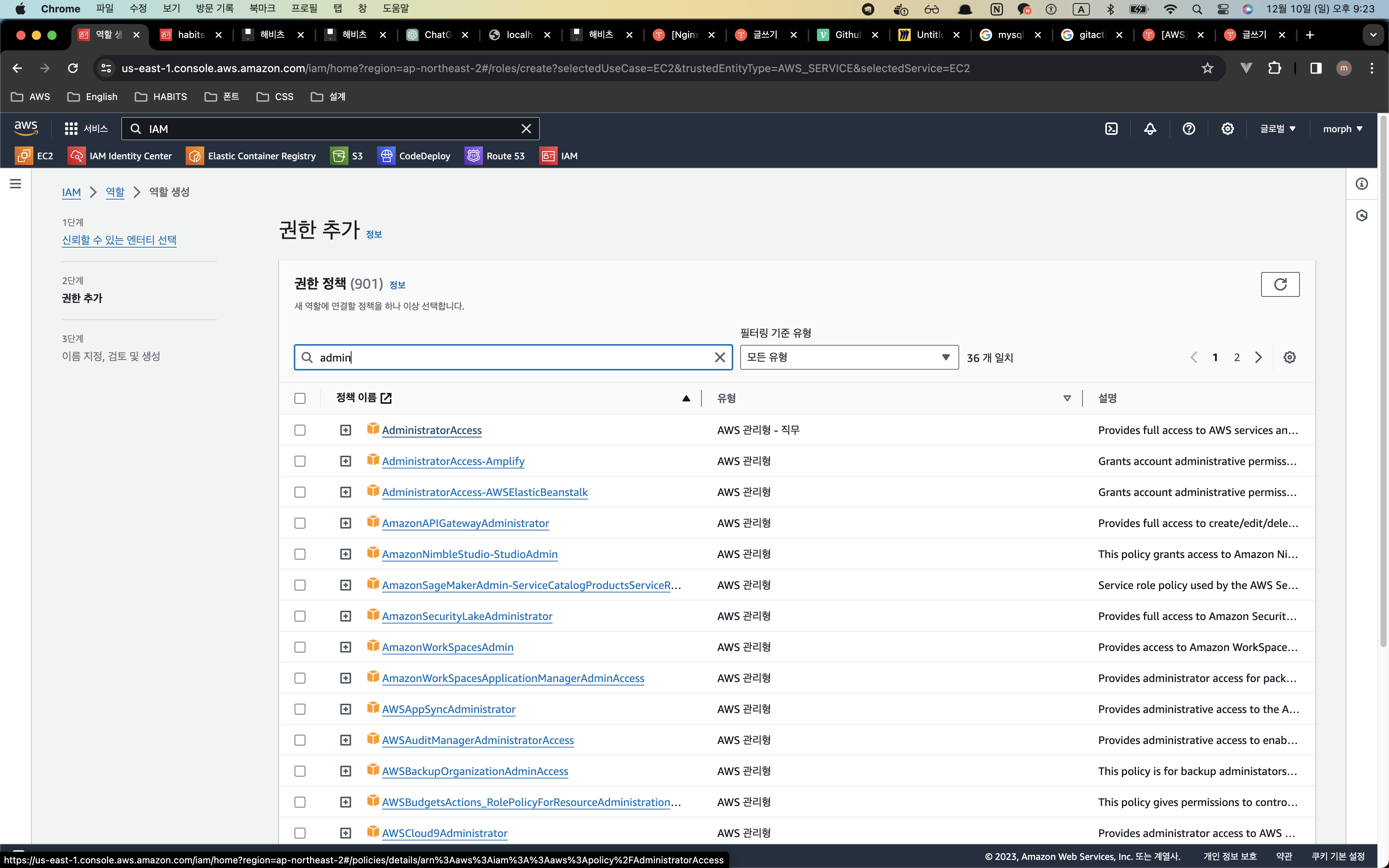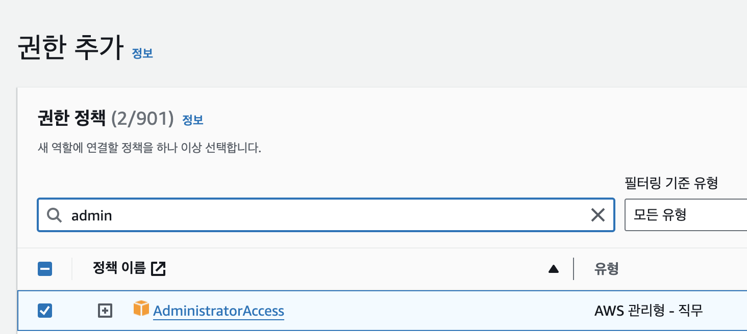 여기에서, CI/CD 구성에 필요한 아래와 같은 권한들을 직접 선택해 주어야 한다.