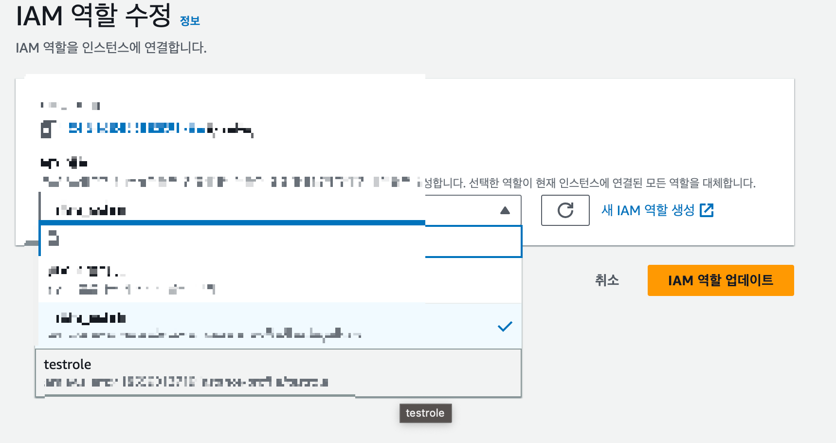 IAM 역할 수정 페이지에 들어가면 기존에 생성했던, IAM 역할을 선택할 수 있고, 이후 업데이트 버튼을 클릭 해 준다.